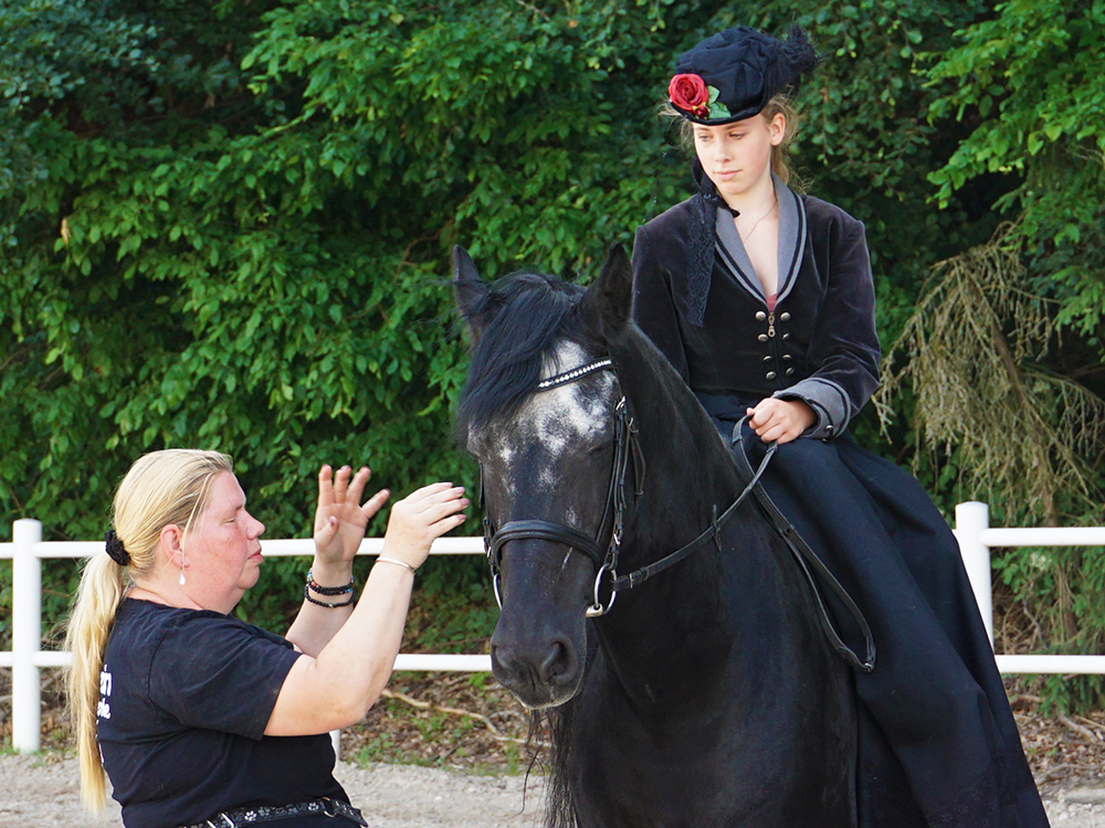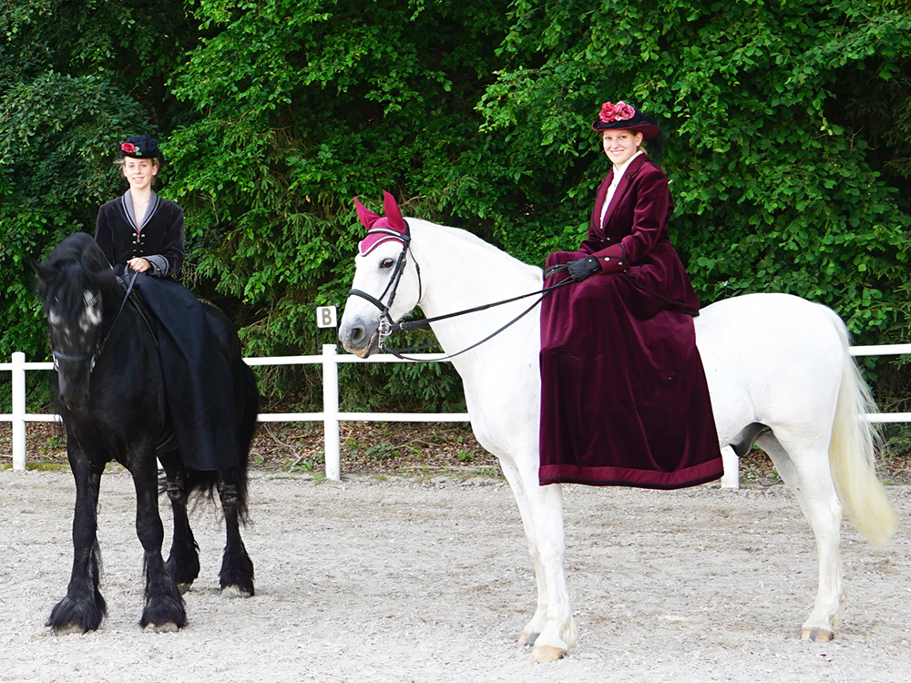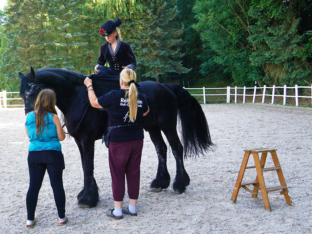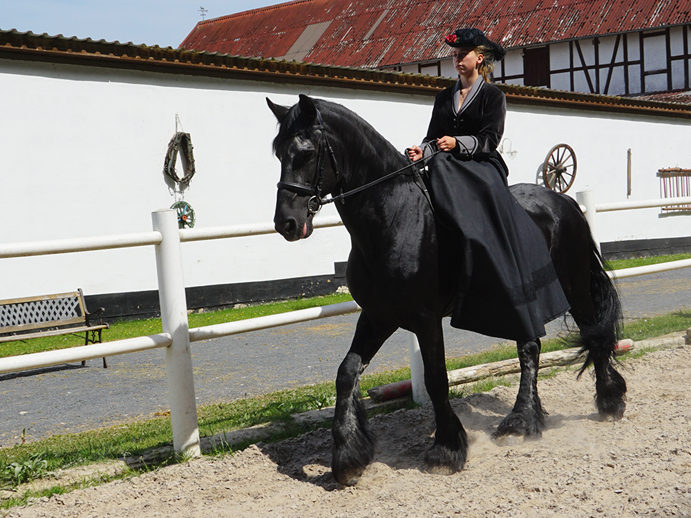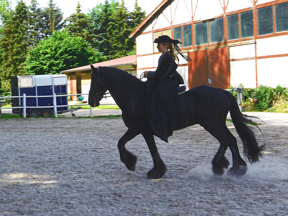 Bis wir so weit sind, wartet der erfahrene Friesen-Hengst Helge geduldig auf unser Startzeichen. Wir sind nicht alleine auf dem Reitplatz. Zwei Reiterinnen aus dem Verein zeigen uns, wie das Reiten im Damensitz in Perfektion aussieht. Wir schmelzen dahin, bevor wir das Abendteuer selbst wagen.