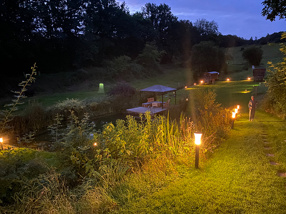 Ihr bekommt ein Gratiskonzert der Grillen und Frösche, die sich hier in den Gräsern verstecken. Egal, ob ihr es euch noch draußen gemütlich macht, oder euch schon unter die Bettdecke muckelt. Es ist schon eine ganz besondere Atmosphäre, wenn man lauscht und Ausschau hält, ob nicht ein Waschbär oder Eichhörnchen zum Fenster reinschaut.